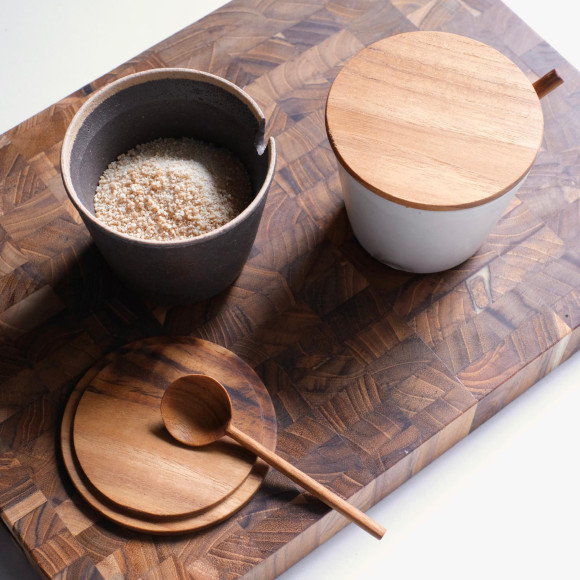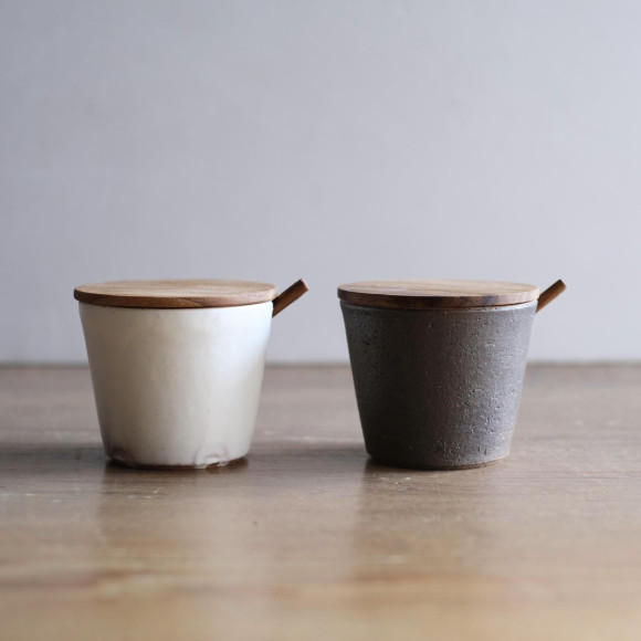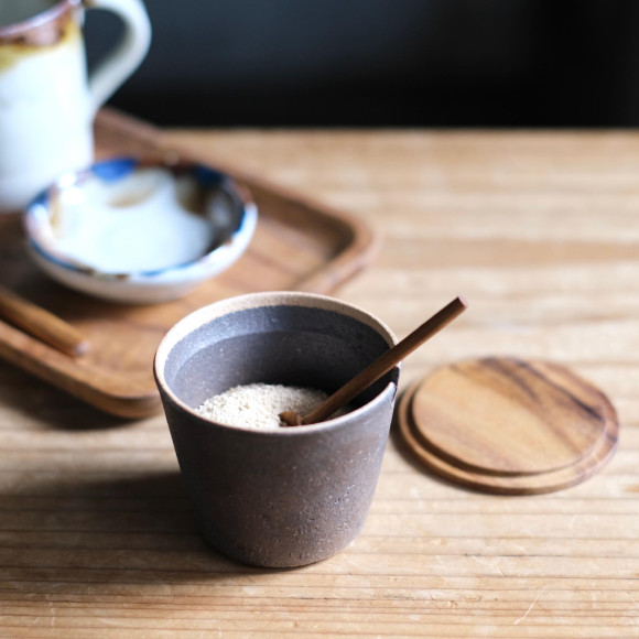 Sugar pot with Shigaraki pottery, teak lid, and special spoon.