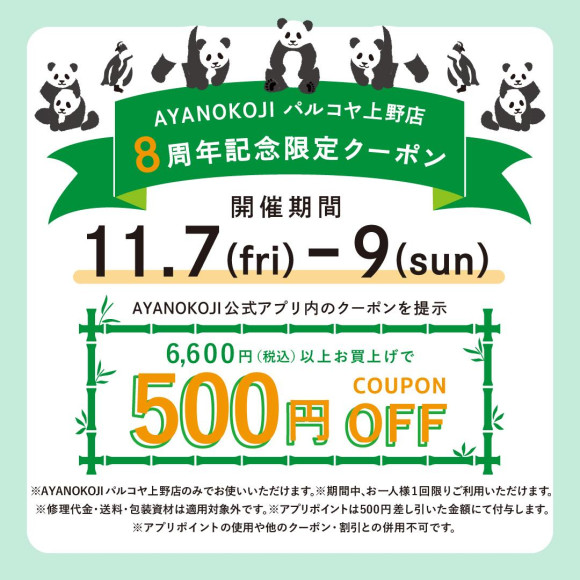【500 yen OFF coupon】 During the period from November 7th (Fri) to November 9th (Sun), you can use the app's 500 yen OFF coupon if you purchase more than 6,600 yen (tax included) at Parcoya Ueno store! Please take this opportunity to shop♪